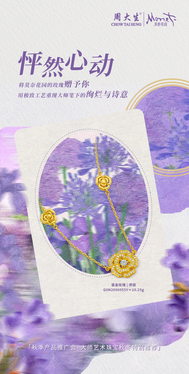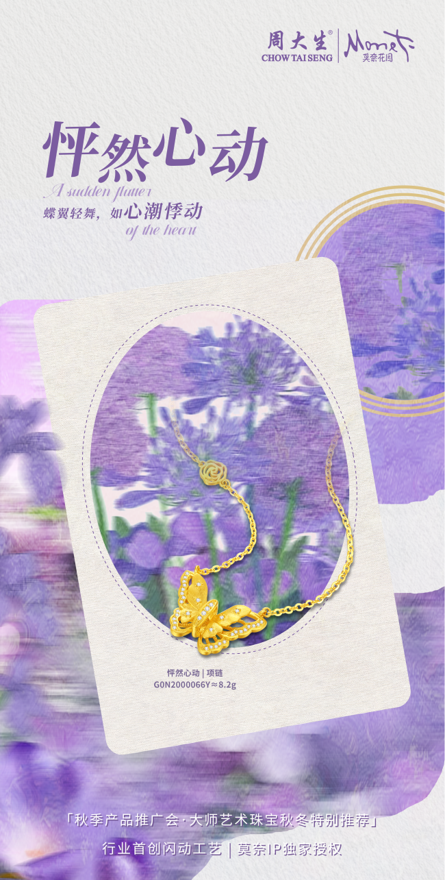 莫奈系列“光影织梦”,从莫奈画作中转瞬即逝的光影汲取设计灵感。周大生大师艺术珠宝从花园飞舞的蝴蝶上,撷取灵动的元素,研创出独家光影珐琅工艺。在日光的映照下,“光影织梦”悄然变幻色彩,恰似莫奈笔下那流动而迷人的光影世界。爱,是蝶翅轻扇的0.1秒悸动,是蝶翼上流转的虹光,是莫奈为心跳调制的那一抹浪漫滤镜。“光影织梦”不仅是对爱的深情诠释,更是将这份浪漫凝固于时光之中。