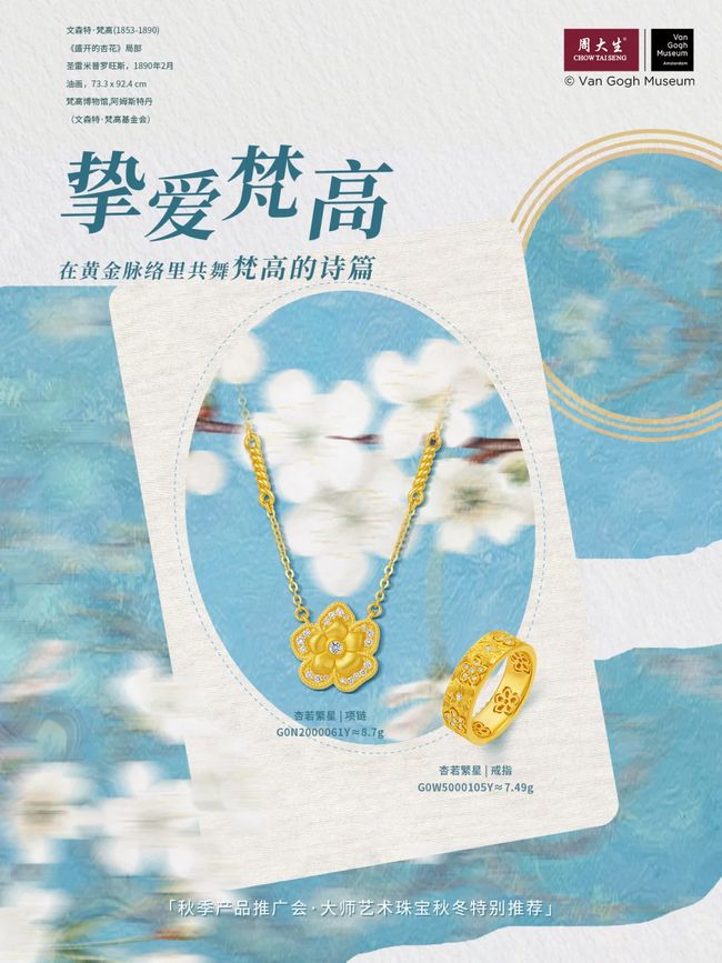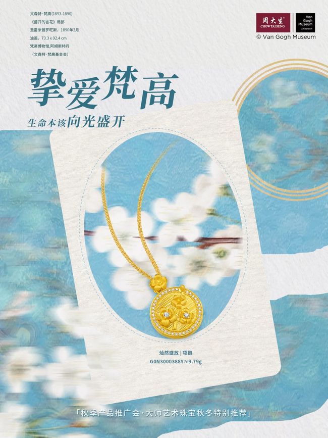 自2017年首次携手梵高IP以来,周大生大师艺术珠宝便开启了一场与这位印象派大师的深度精神共鸣之旅。截至2025年,这条文化探索之路更显深邃与宽广。品牌已正式与荷兰阿姆斯特丹梵高博物馆——全球珍藏梵高真迹最丰富的艺术殿堂达成合作,以珠宝为媒介,创新性诠释《盛开的杏花》《向日葵》等不朽画作的精神内核。这不仅是对艺术的具象化表达,更是对“向阳而生”、“生生不息”人生态度的深刻呼应。