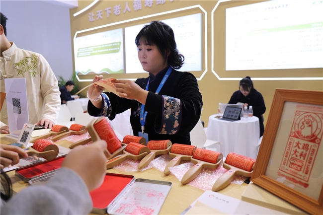 在“福寿疗愈”活动体验专区,推出非遗拓印活动,工作人员配合活动讲解引导长辈沉浸式感受传统文化,本次展会同时开放13种福寿疗愈课程体验名额,包括音乐疗愈、植物疗愈、艺术疗愈、老年瑜伽等,并将音药本草五音疗愈音乐盒进行展示。