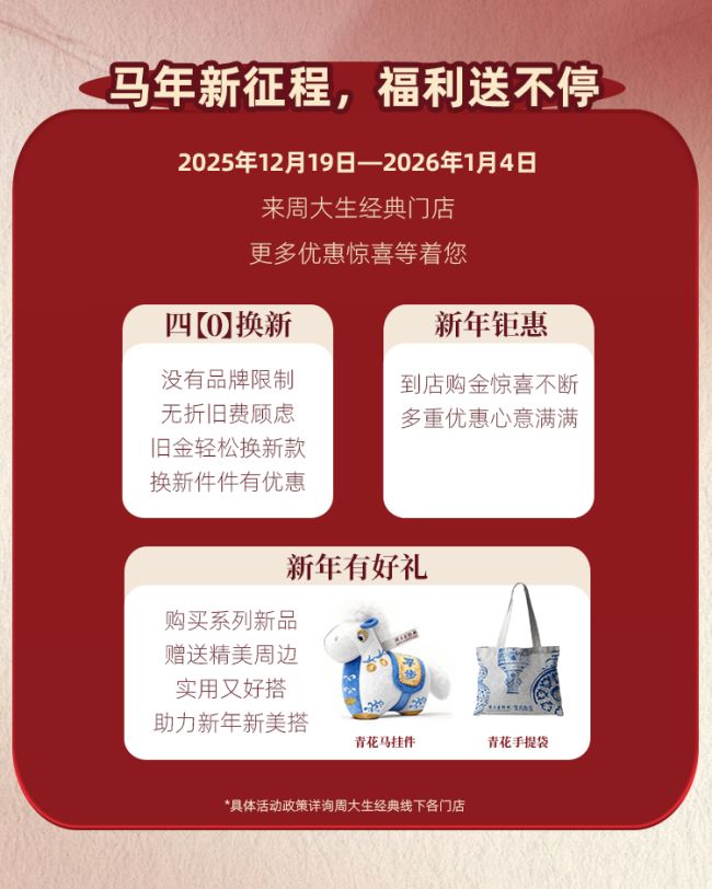 与此同时,周大生经典推出“四0换新”活动,诚挚献礼给每一位热爱时尚新品的消费者。活动期间,前往周大生经典线下门店,即可享受不限品牌、免收折旧费、超值优惠的换新服务,让手中的旧金饰焕发全新光彩。更令人惊喜的是,凡选购周大生经典各大系列的新品,还可获赠限量版青花手提袋或青花马挂件等精美周边礼品,将东方雅韵带回家中,点亮别具一格的璀璨新年。