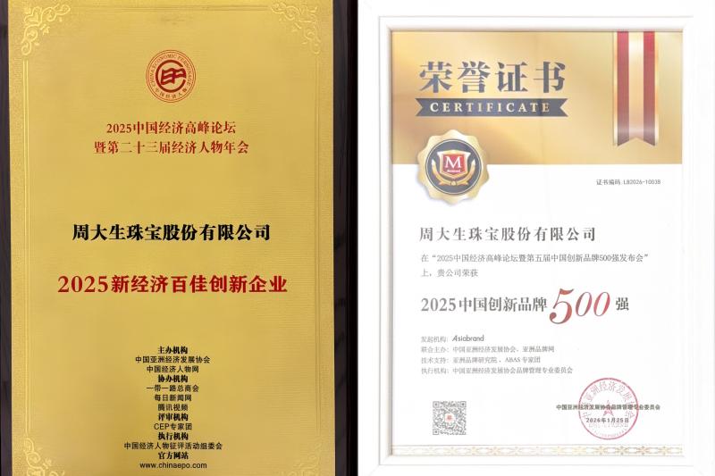 在品牌实力屡获认可的同时,周大生在创新与新经济领域亦表现卓越,同步入选“2025中国创新品牌500强”与“2025年新经济百佳创新企业”。周大生珠宝董事长周宗文亦凭借其在品牌创新与战略布局中的杰出引领,荣膺“2025新经济百名杰出人物”称号。