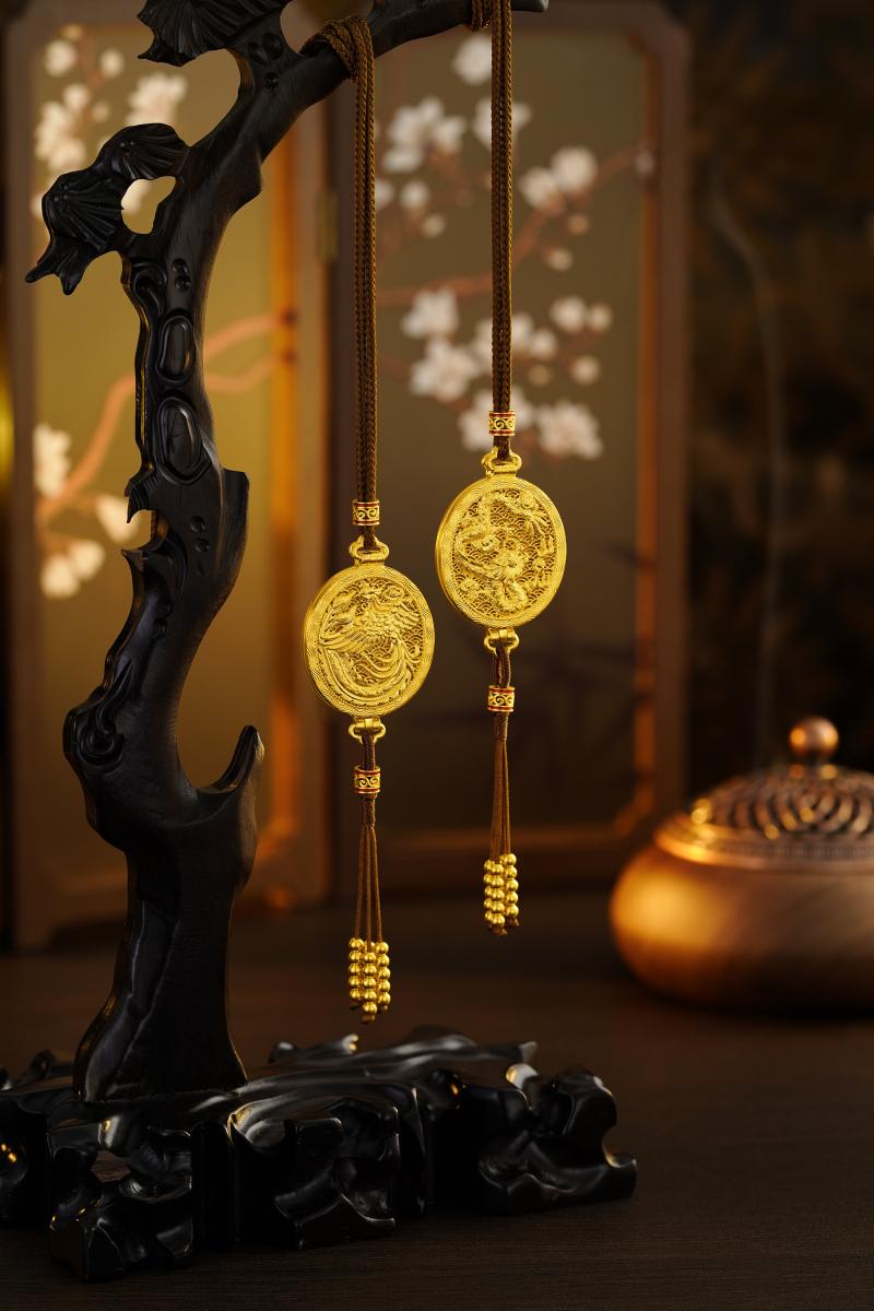 本次展出的“云锦系列”,由品牌携手云锦国家级非遗代表性传承人金文,以云锦织机穿梭千年的金线为灵感,共同研发“云锦织金”工艺,并与国宝宋《百花图》卷精妙合璧,为当代雅奢人士呈献可点睛、可品鉴、可家藏、可传世的国宝文脉臻藏金品。系列代表作云锦龙凤香囊,其凤纹羽翼层叠、灵动翩然,灵感便源自巴蜀文脉国宝“红绸盘金绣花蟒鳯衣”上的凤纹图腾。千年国宝的祥瑞气韵,在香囊之上化为平安顺遂、吉祥安康的随身祝福。产品以“云锦织金”工艺为底,辅以手工錾刻与拉丝工艺细细雕琢,于柔美中见筋骨;外框盘绕水波纹,线条流畅而富有张力;宝石级透底珐琅点缀其间,色泽温润如玉;末端垂流苏金珠,晃动间尽显宫廷雅器的灵动气韵。香囊背面饰以祥云缠枝纹,将吉祥如意的东方意蕴融于方寸之间。