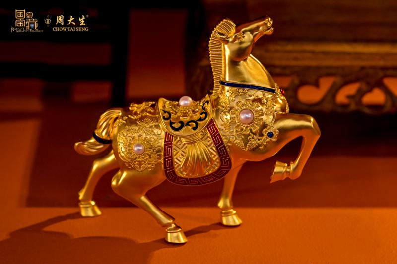 马年文化金品,以《国家宝藏》栏目中“马文化”代表文物为设计蓝本,以古法金艺锻造灵动金芒,层叠金纹如浪似风,诠释“骏驰不息”的东方进取哲思。系列产品“宝相金骏”摆件的登场,则将现场气氛推向高潮,其蕴含的奔腾向上之姿,亦与成都这座城市昂扬进取的城市精神遥相呼应。