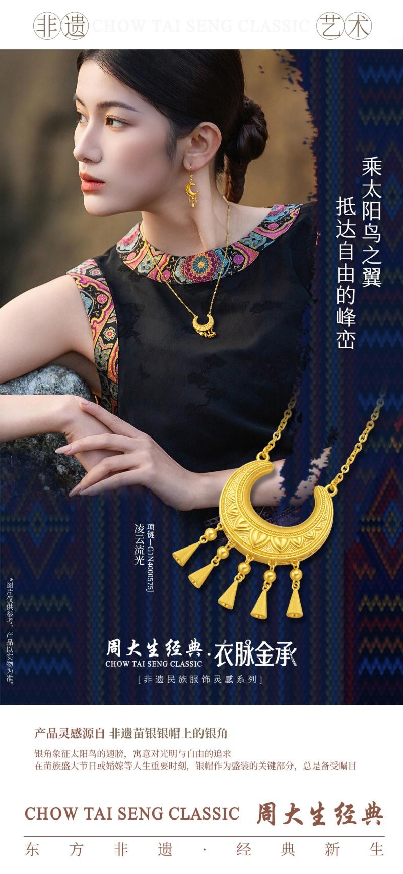周大生经典“凌云流光”项链以苗银银帽上的银角为灵感核心,延续苗族图腾中“太阳鸟羽翼”的文化意象——这一承载着苗族对光明与自由执着追求的符号,经现代审美淬炼,褪去传统银饰的厚重感,提炼出利落流畅的线条。工艺上,以古法金为基底,复刻苗银反复锻打、精细塑形的精髓,再通过反复打磨,让黄金表面呈现如苗绣织物般的细腻触感,光线下泛着丝绢般的柔光,光影流转间似太阳鸟振翅的流光。颈间佩戴,既藏追寻光明、无畏前行的非遗祈愿,又以干练大气的当代设计适配职场、日常等多元场景,让非遗基因在颈间跃动,让古法新艺的质感自然融入生活。